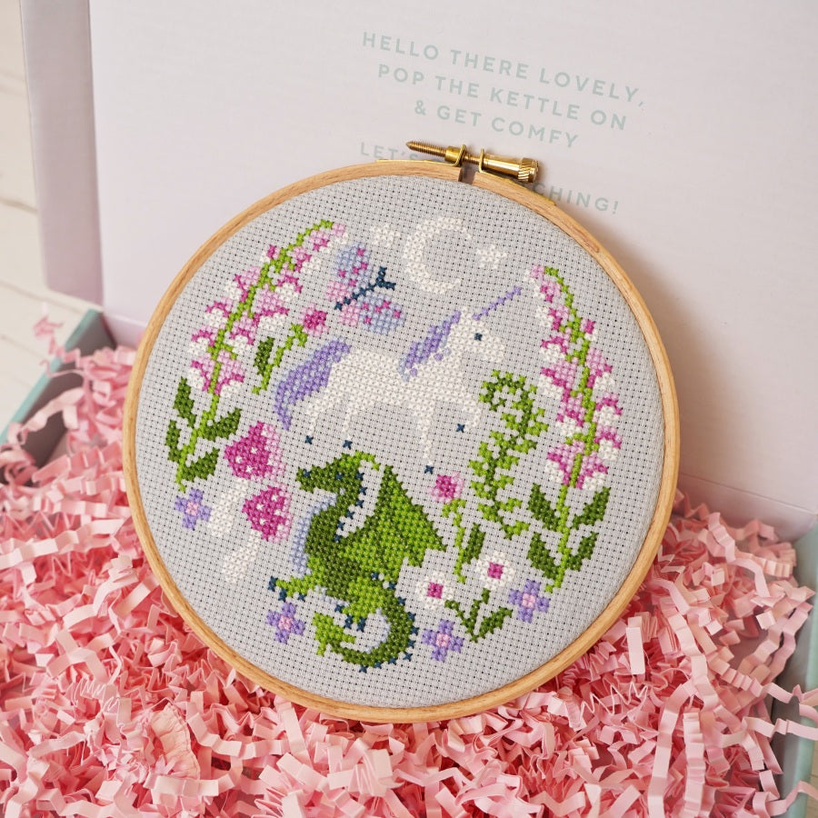 Sign up and you'll be guaranteed a place for all future boxes. Cancel or pause at any time! The cross stitch kit comes with all supplies needed (listed below) and 3 other goodies. You can also buy a box and have it shipped to someone else as a gift with a handwritten personalised gift note (please leave us a note at checkout). Shop the 12 month offer here.